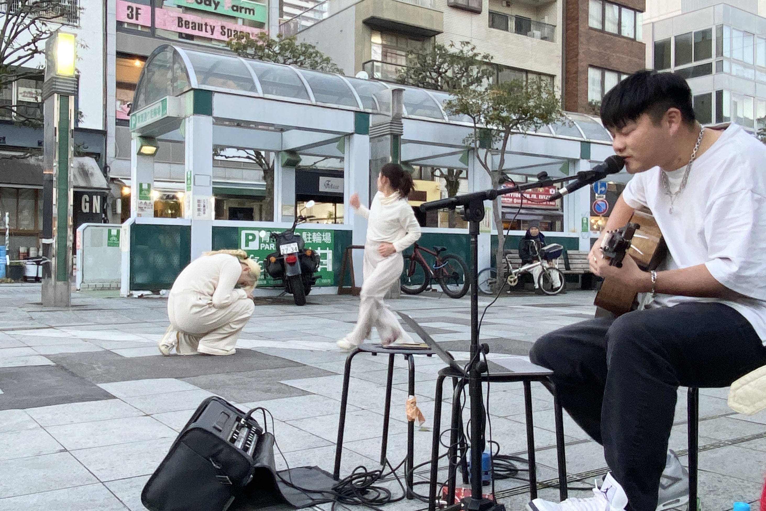 “駅前の路上で歌うミュージシャンとダンスでセッションできたらきっと面白いのではないか!”と突如、「劇場」を飛び出しアウトリーチを行う企画として発想。新宿駅南口前で偶然出会ったシンガー目良政十朗とともに東京・代々木公園、静岡駅前・青葉シンボルロードの2箇所にてコラボセッション・パフォーマンスを行いました。