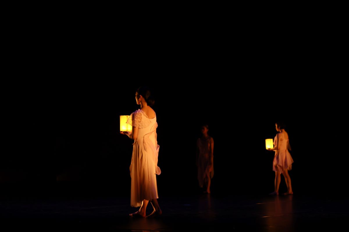 大学在学時の卒業制作作品です。10分弱の小品ではありますが、19名での大群舞による壮大な表現が込められた作品で、「花筏」は散った桜の花びらが川の水面に浮かび、それが静かに流れていくさまを当てた言葉で本作のモチーフです。舞台の下手から上手へと繰り返し入りはハケする流れを川の流れに見立て展開します。